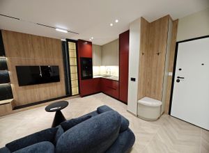 The apartment is located on the third floor of a building in the center of Durrës, near the prefecture. The apartment has an area of 62 m2 and is organized into a living room and kitchenette, one bedroom, one bathroom, and a balcony. The apartment is fully renovated and furnished in a modern style with quality appliances.